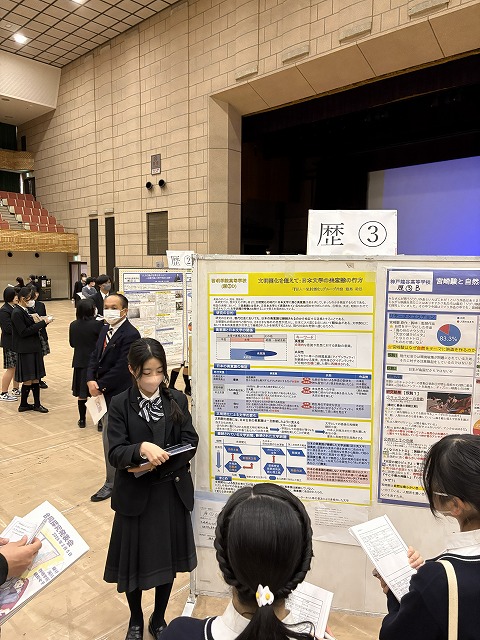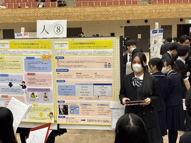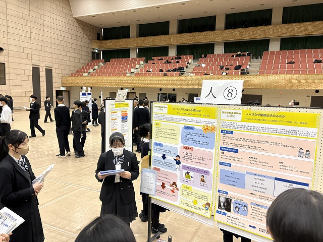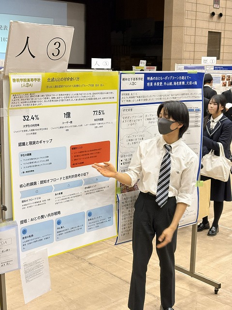 啓明学院からは3年生全員が参加し、21名が研究成果のポスター発表をしました。これは、高校2年次、3年次に「学術研究」の授業で取り組んだ成果をまとめたものです。